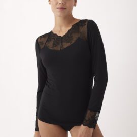 Con cuello en V con suave encaje y tirantes finos regulables.