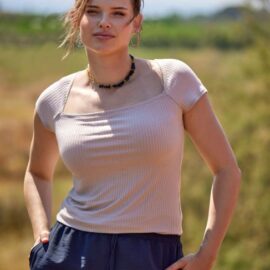 Manga corta ranglán con original escote cuadrado.