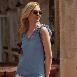 Sin mangas, con cuello en V con detalle de blonda de la serie al tono de color.