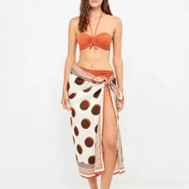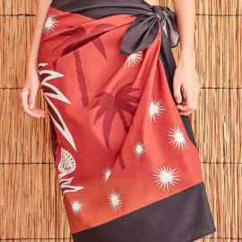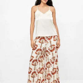 Pantalón palazzo en suave viscosa y estampado de palmeras a juego.