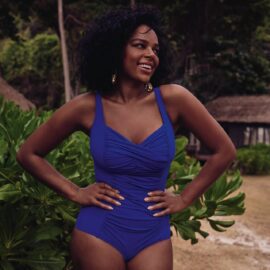 Escote tipo corazón y parte delantera con cuerpo drapeado que le da carácter y disimula las imperfecciones.