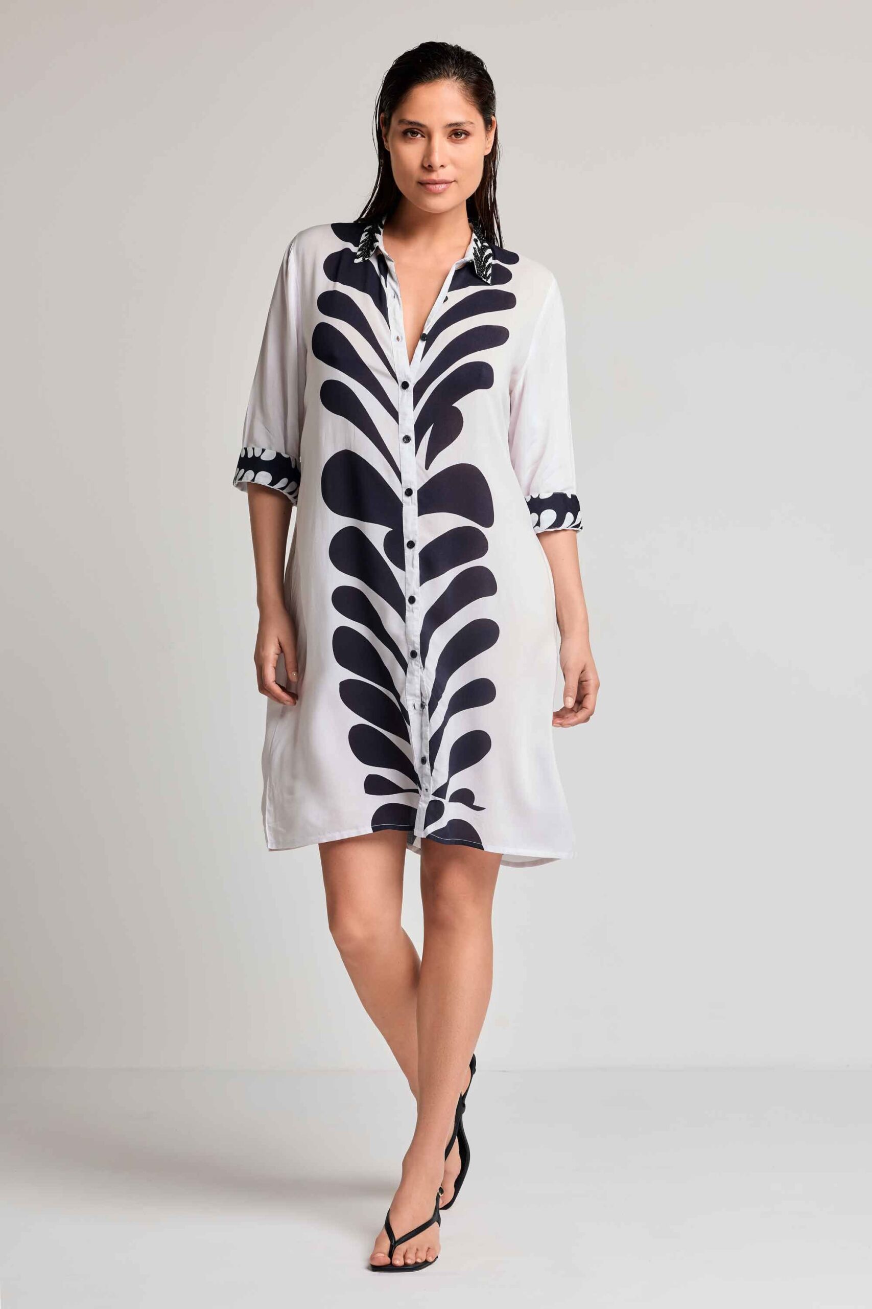 Con cuello, abierto abotonado y con mangas 3/4.