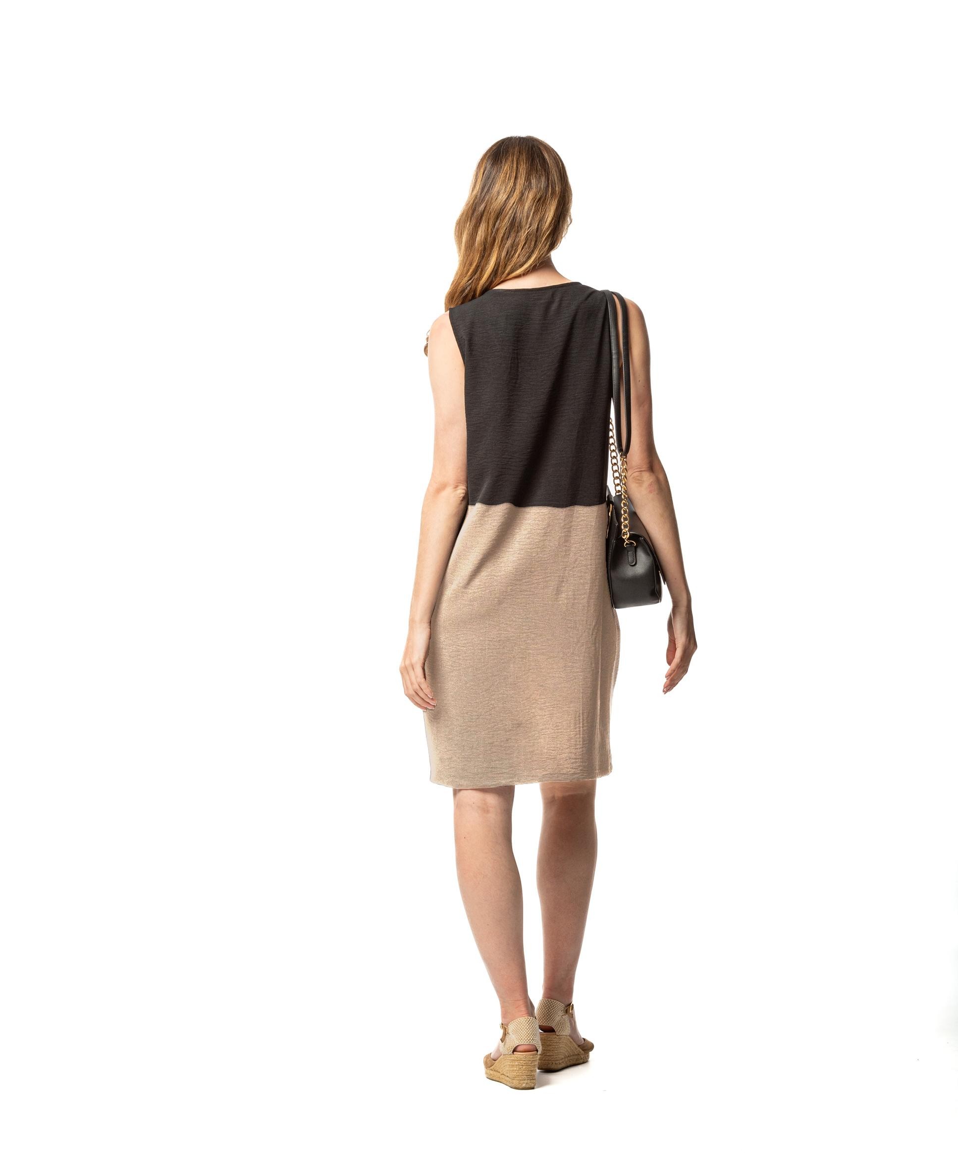 Sin mangas, con escote en V y pliegues bajo el escote para dar más aplitud.