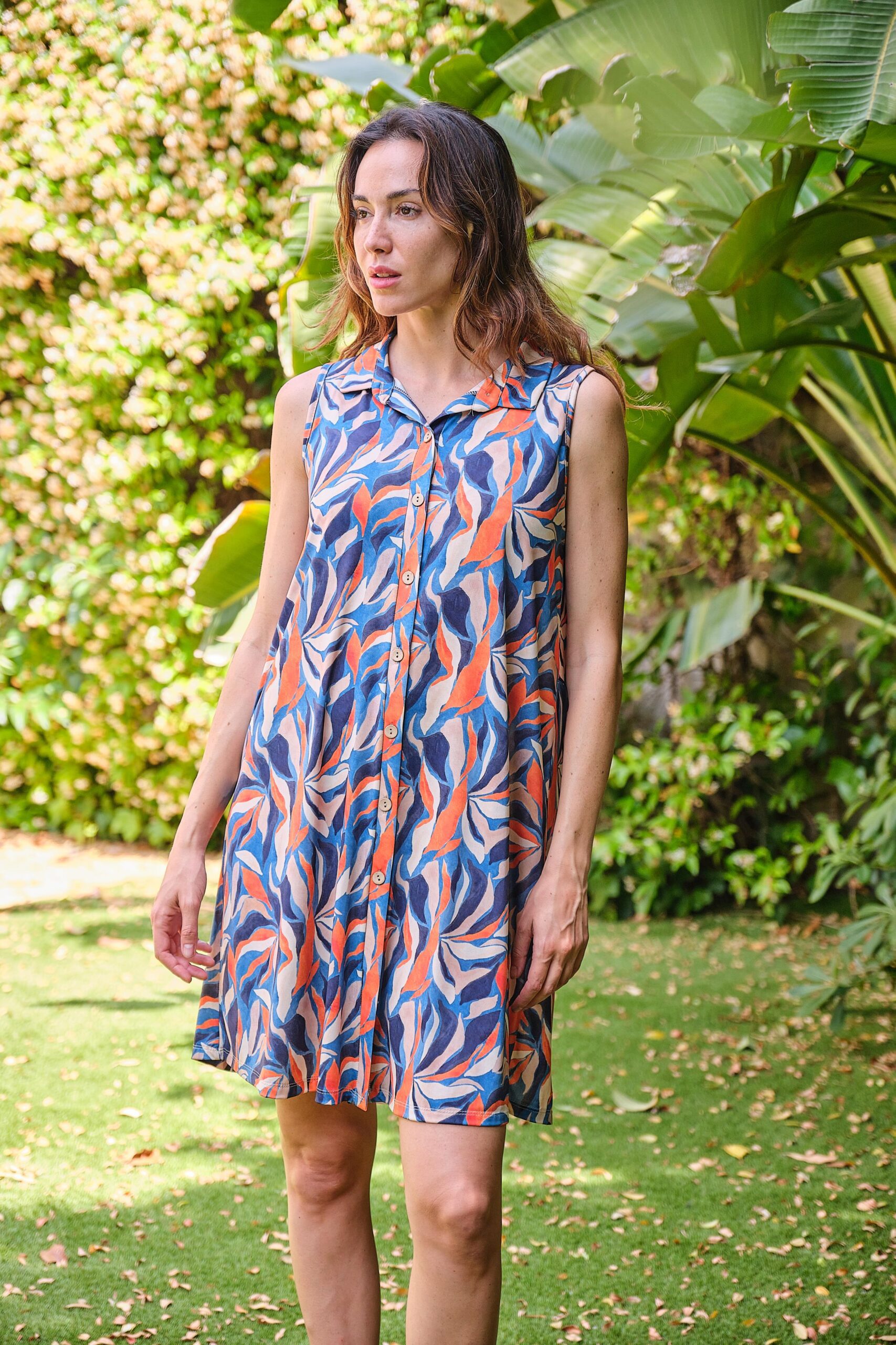 Sin mangas, con escote en V y pliegues bajo el escote para dar más aplitud.