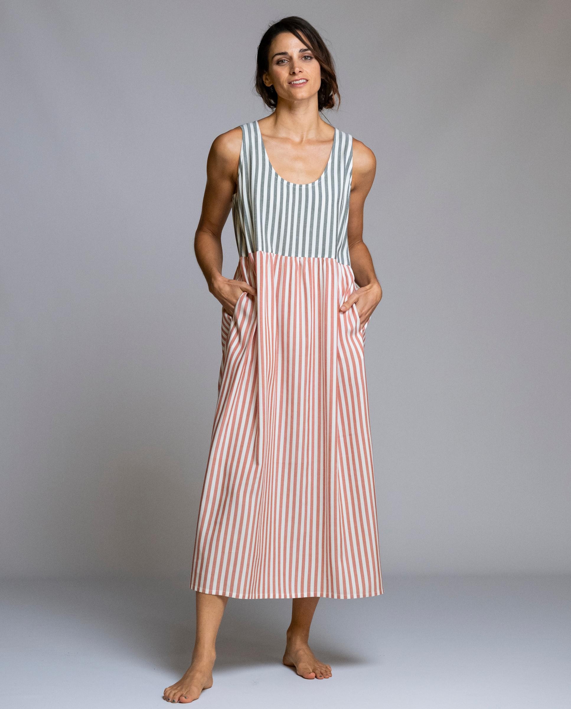 En bicolor con estampado a rayas verticales muy favorecedoras.