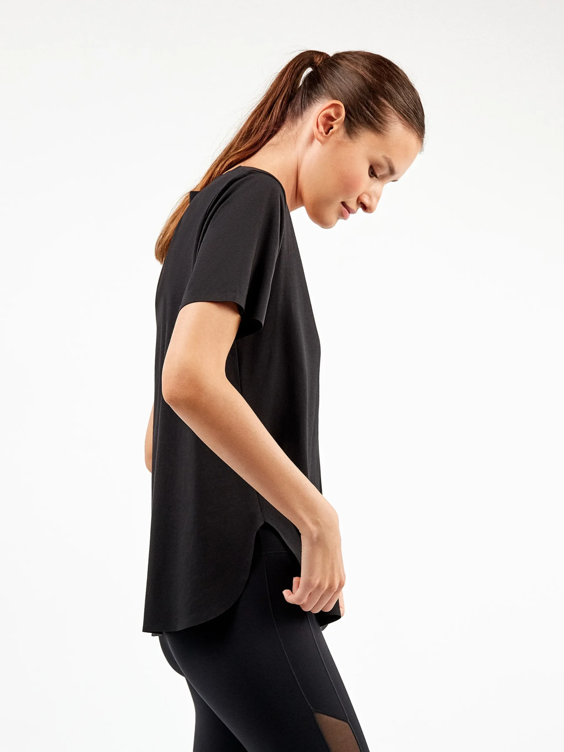 Cuello redondo, manga corta y con ligero capeado en la zona inferior.