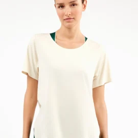 Cuello redondo, manga corta y con ligero capeado en la zona inferior.