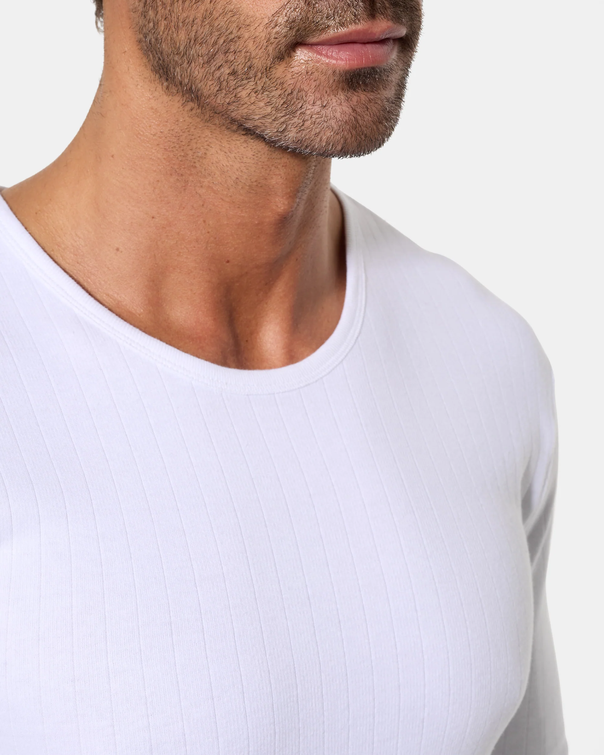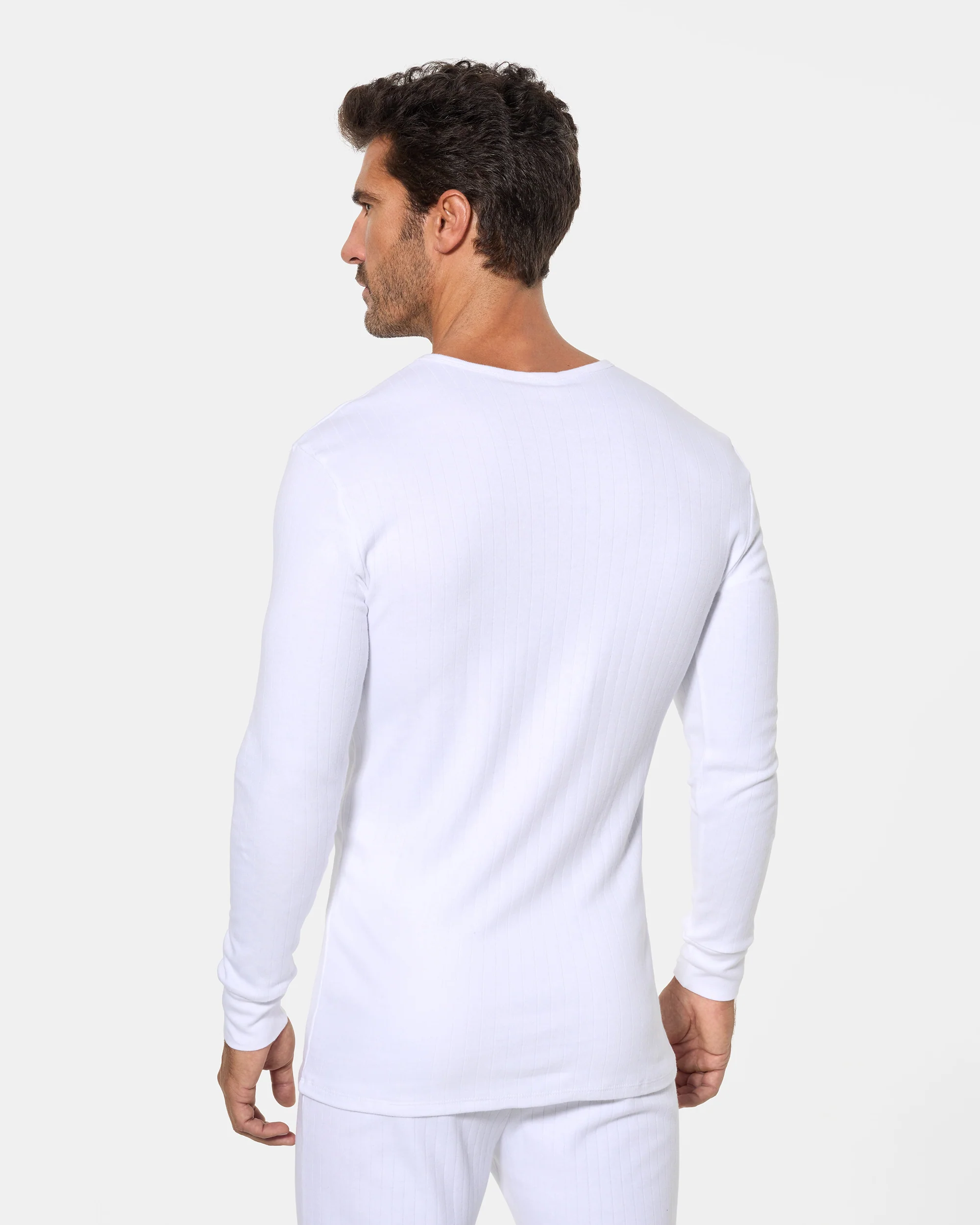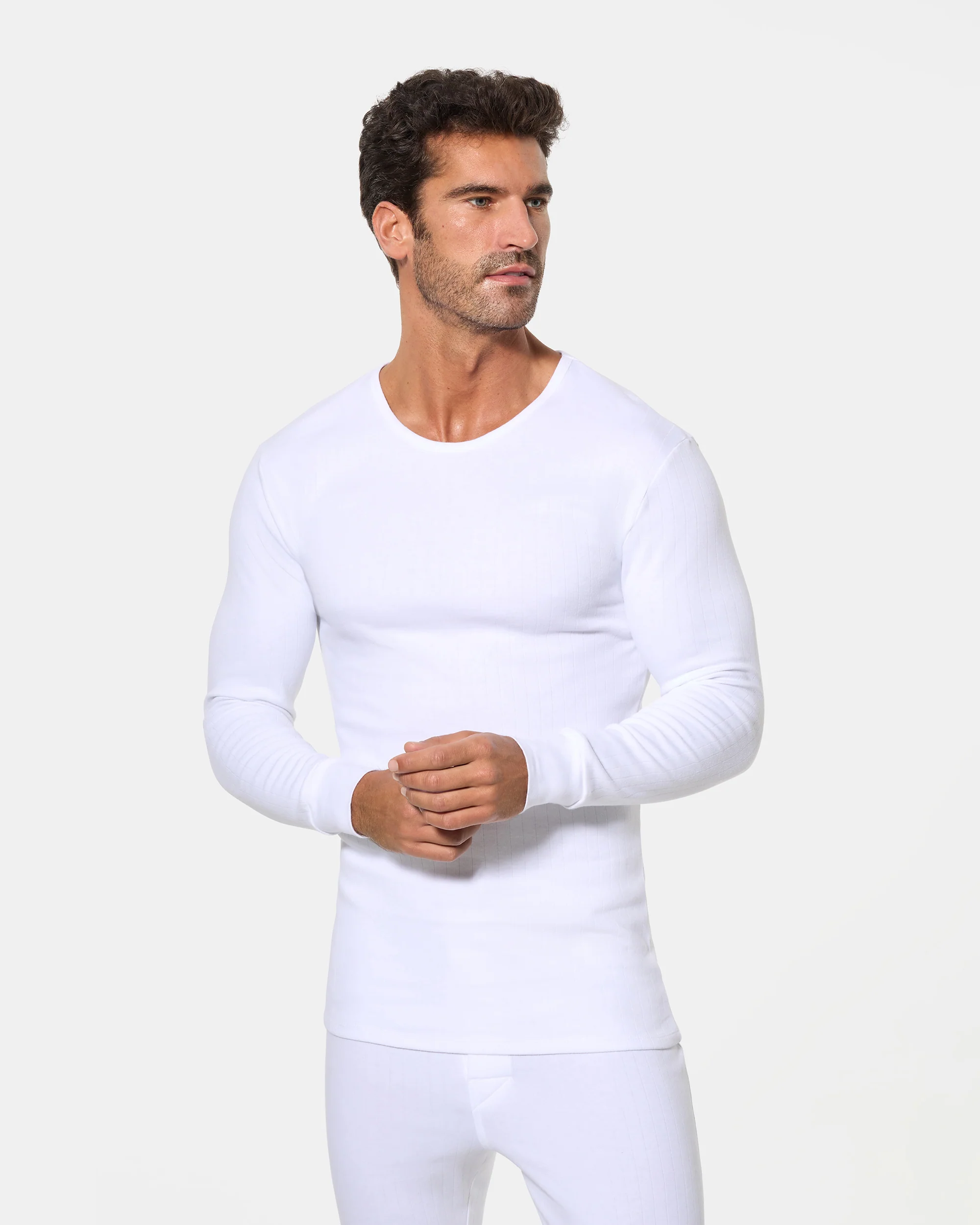 Camiseta interior térmica de manga larga y cuello redondo para hombre, confeccionada con algodón de invierno en tejido Interlock liso.