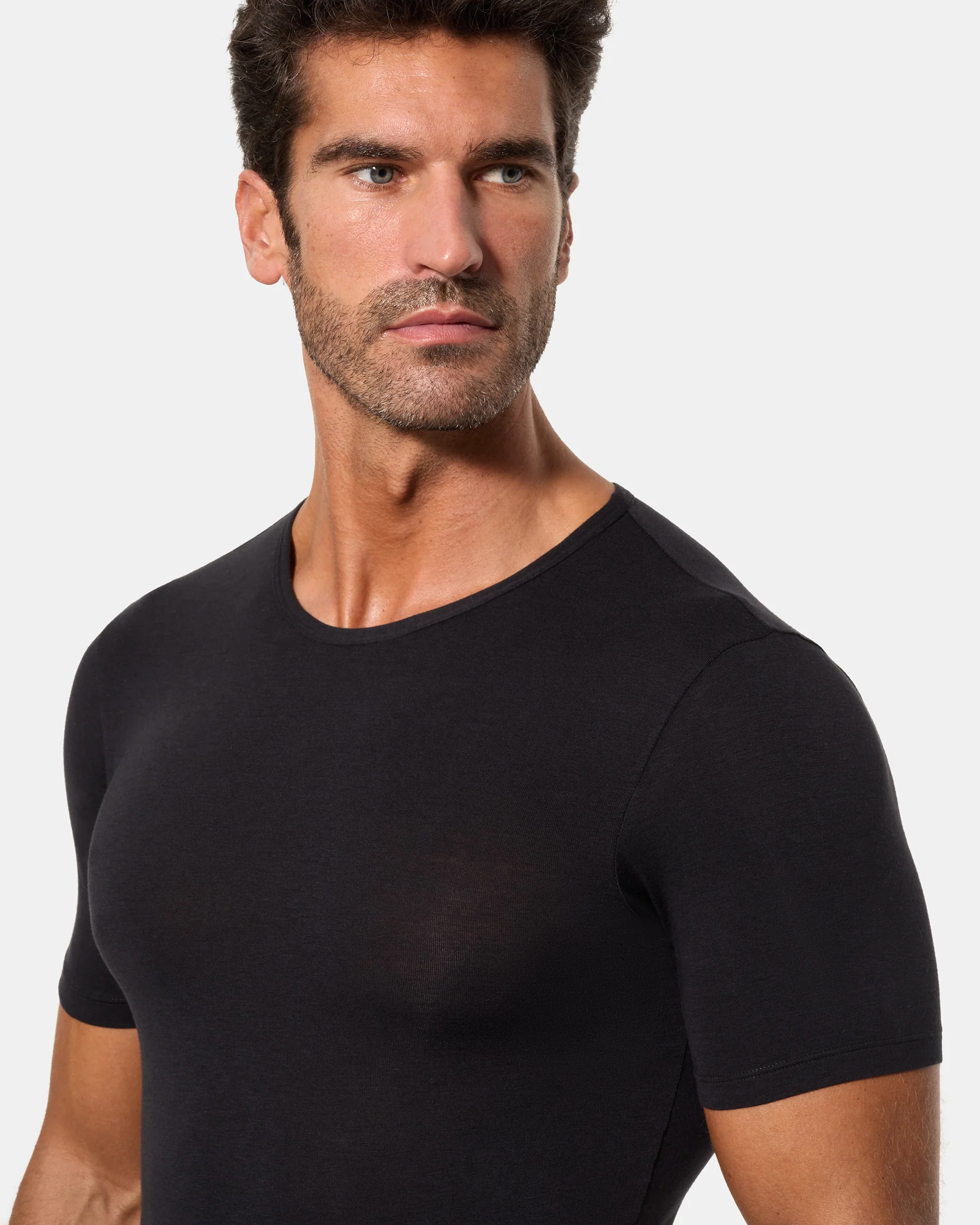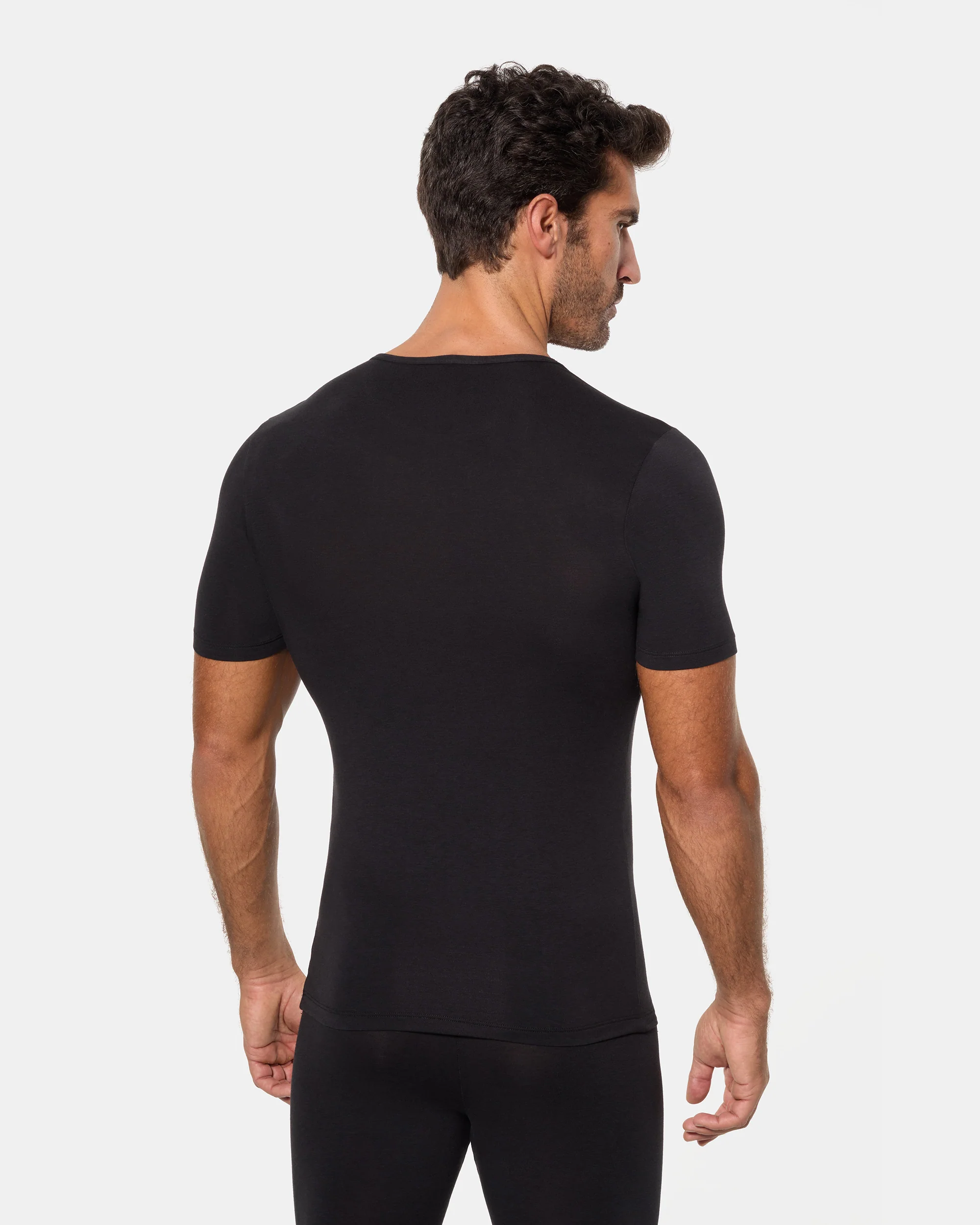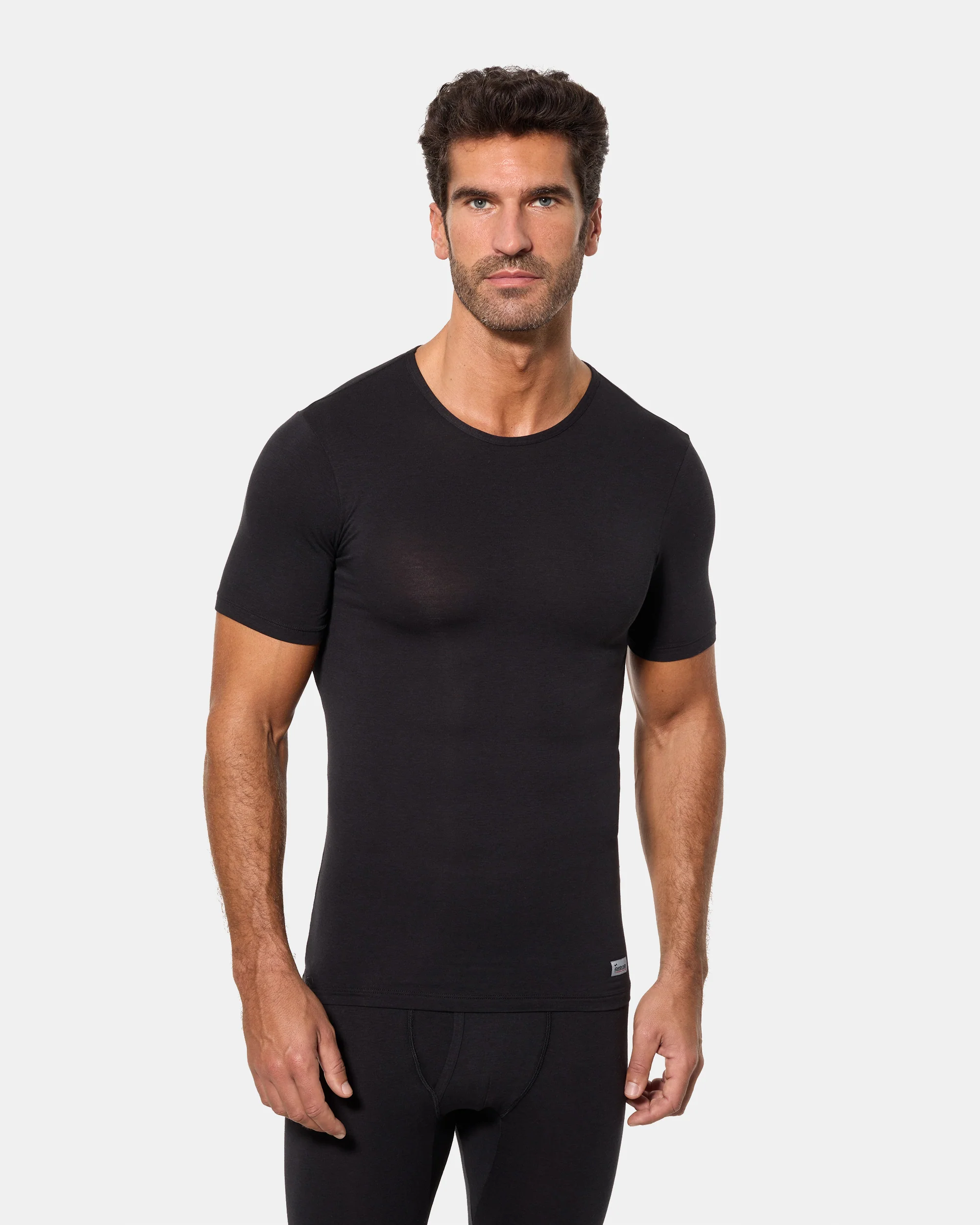 Camiseta interior térmica de manga corta y cuello redondo para hombre, confeccionada con algodón de invierno en tejido Interlock liso.