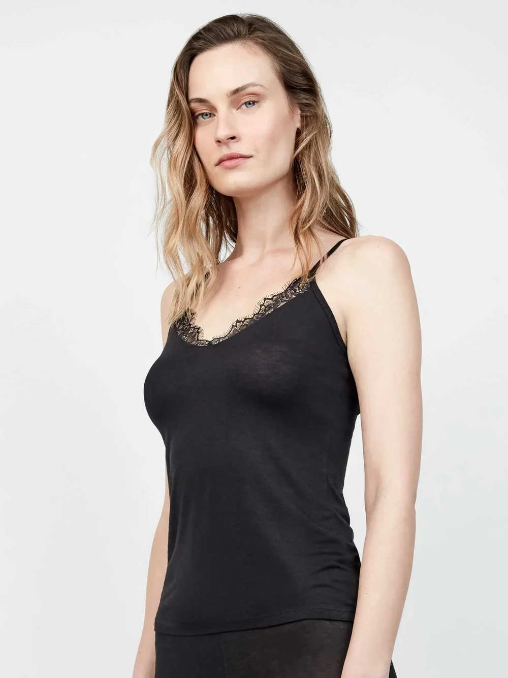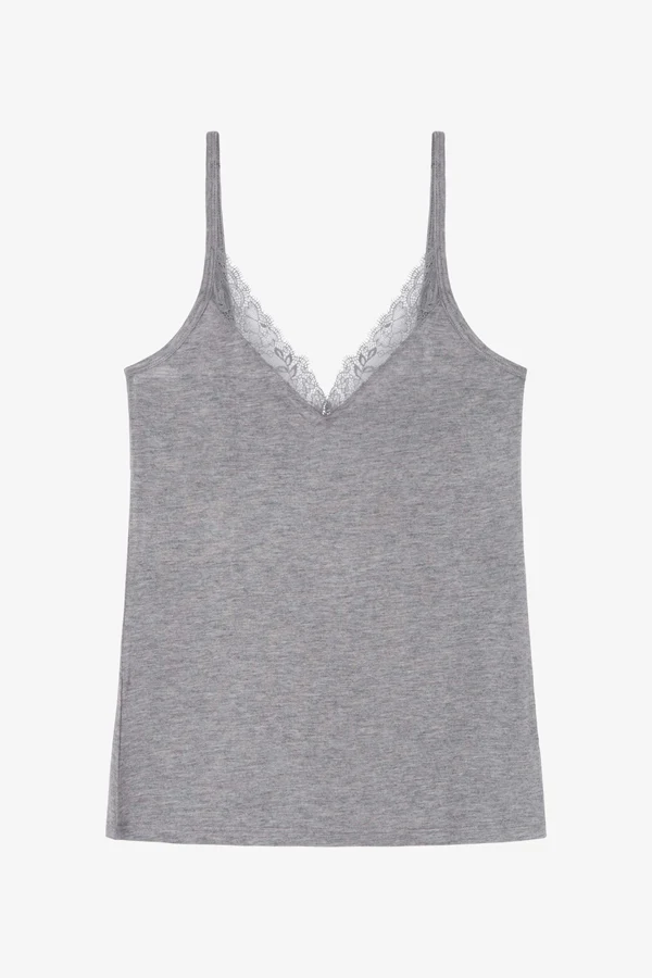Con cuello en V con suave encaje y tirantes finos regulables.