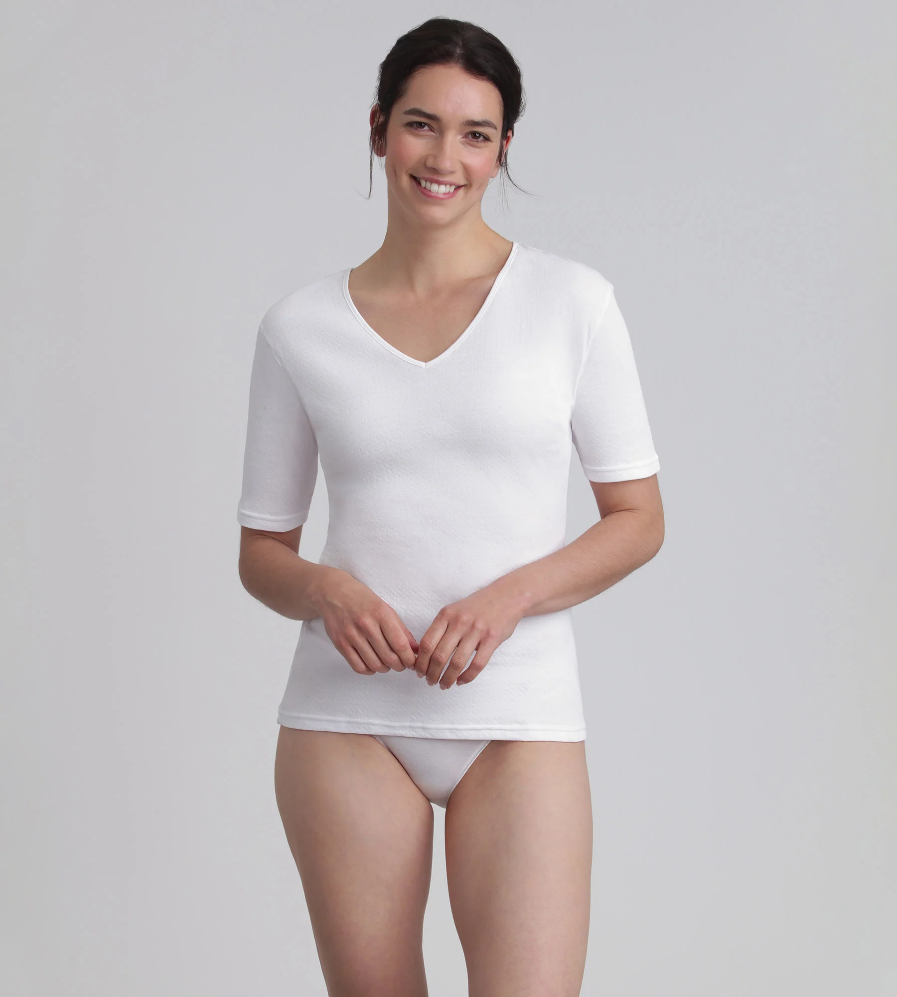 Camiseta manga corta y cuello en V confeccionada con una nueva generación de algodón, muy suave al tacto, con una innovadora tecnología que absorbe la humedad y la expulsa al exterior manteniendo la piel seca.