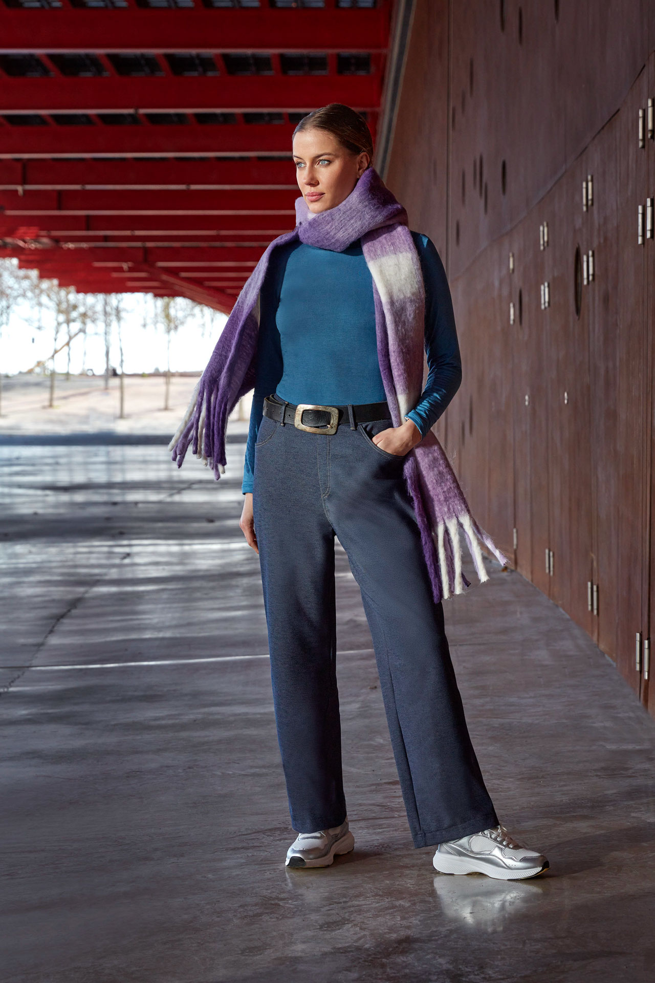 Piernas rectas y anchas con vivos pespunteados a contraste.