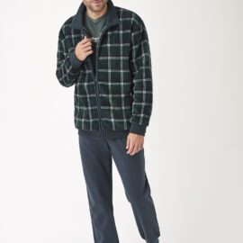 Bata corta con estampado a cuadros, cuello mao, cierre con cremallera y bolsillos laterales.
