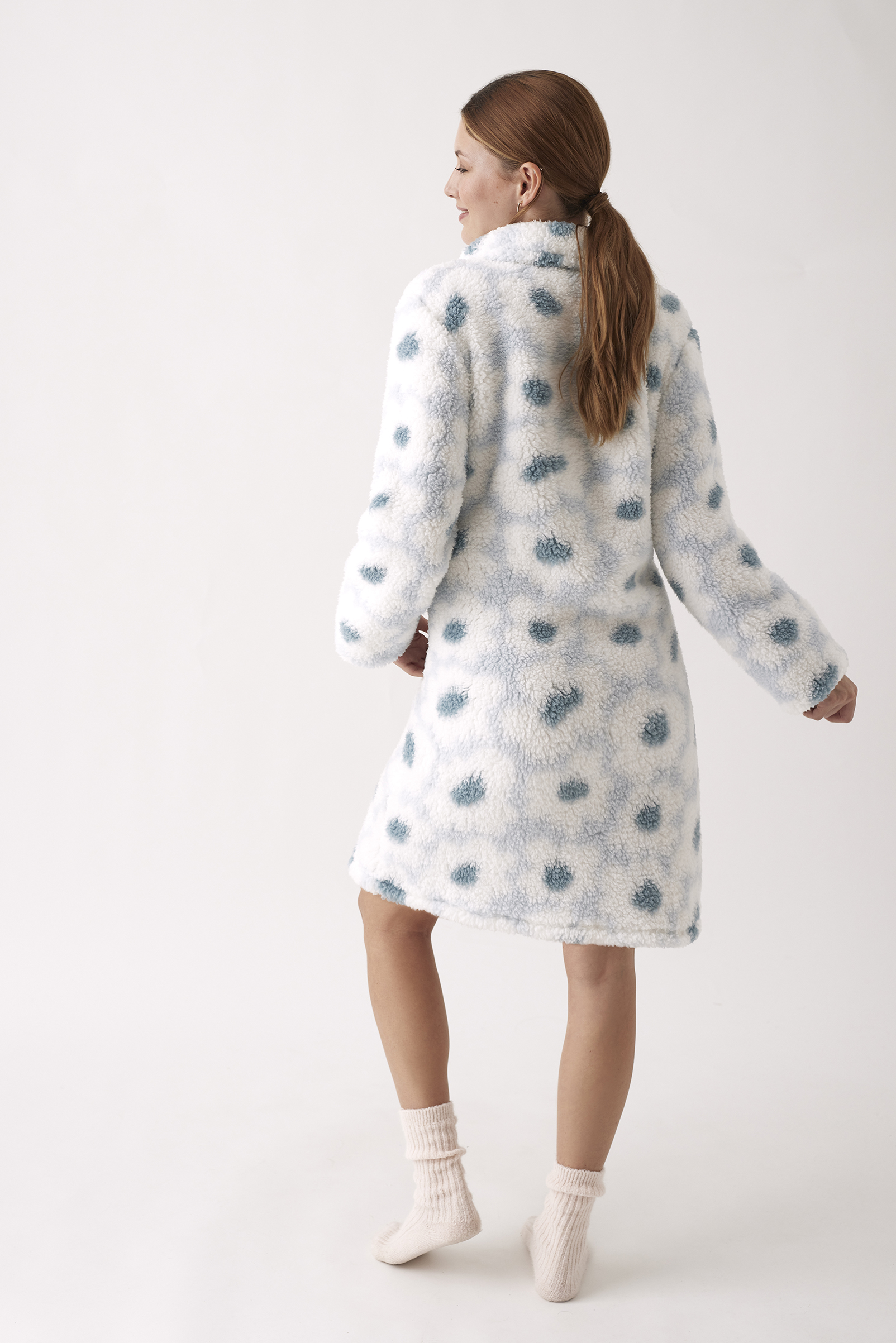 Cuello redondo con tapeta abotonada y ribeteado bordado tanto en escote como en mangas.