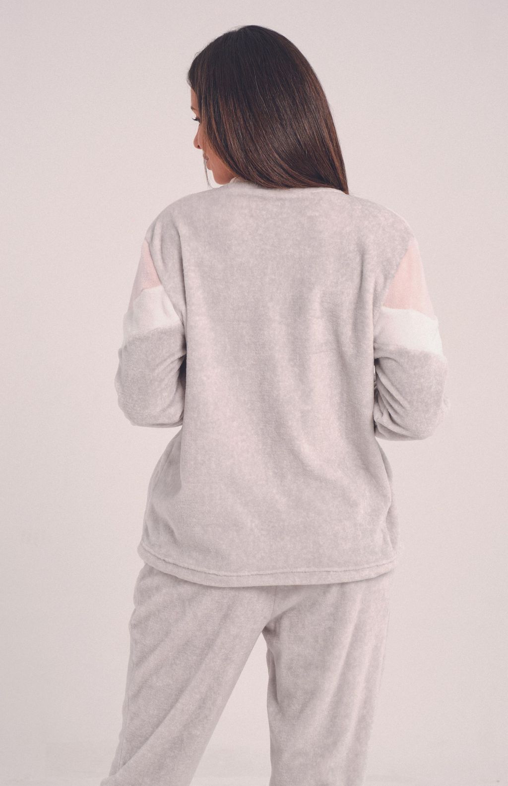 Cuello redondo con tapeta abotonada y ribeteado bordado tanto en escote como en mangas.