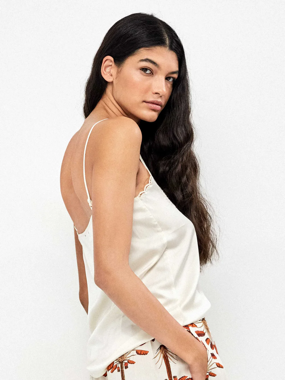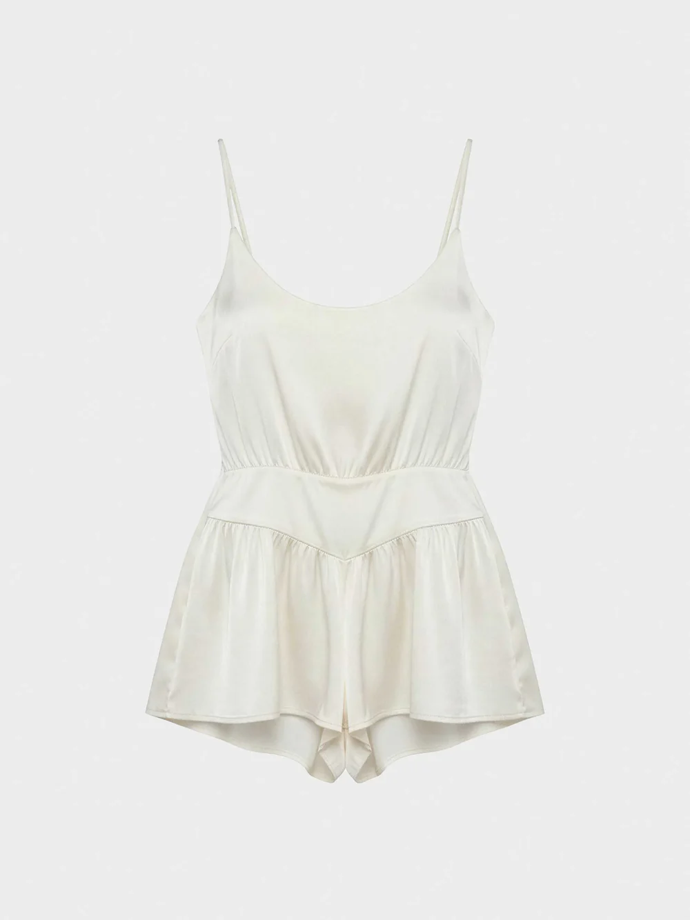 Tirantes finos, cuello redondo con alforzas.