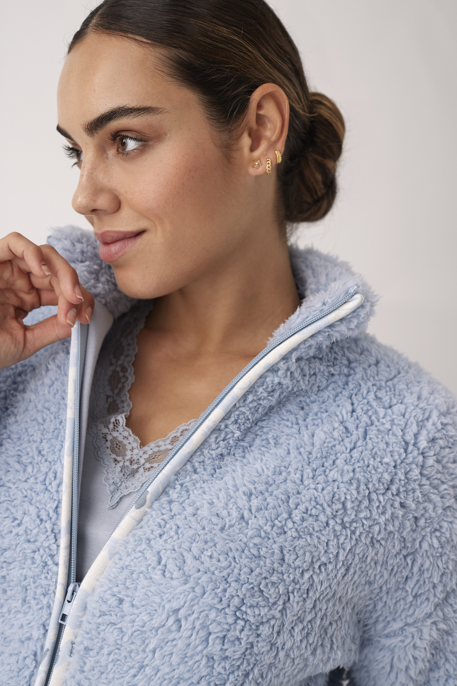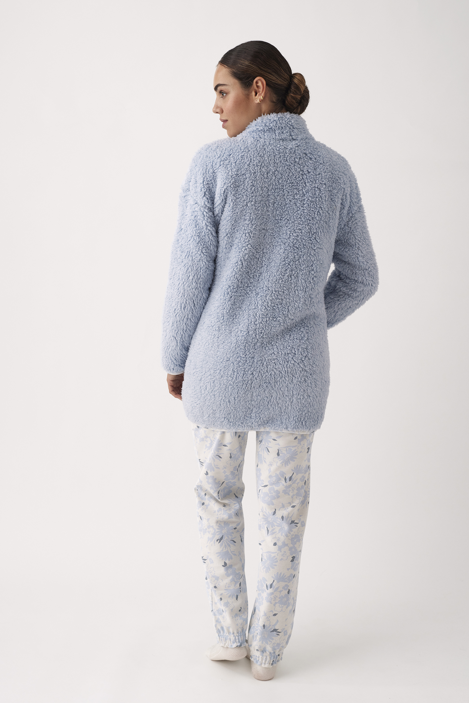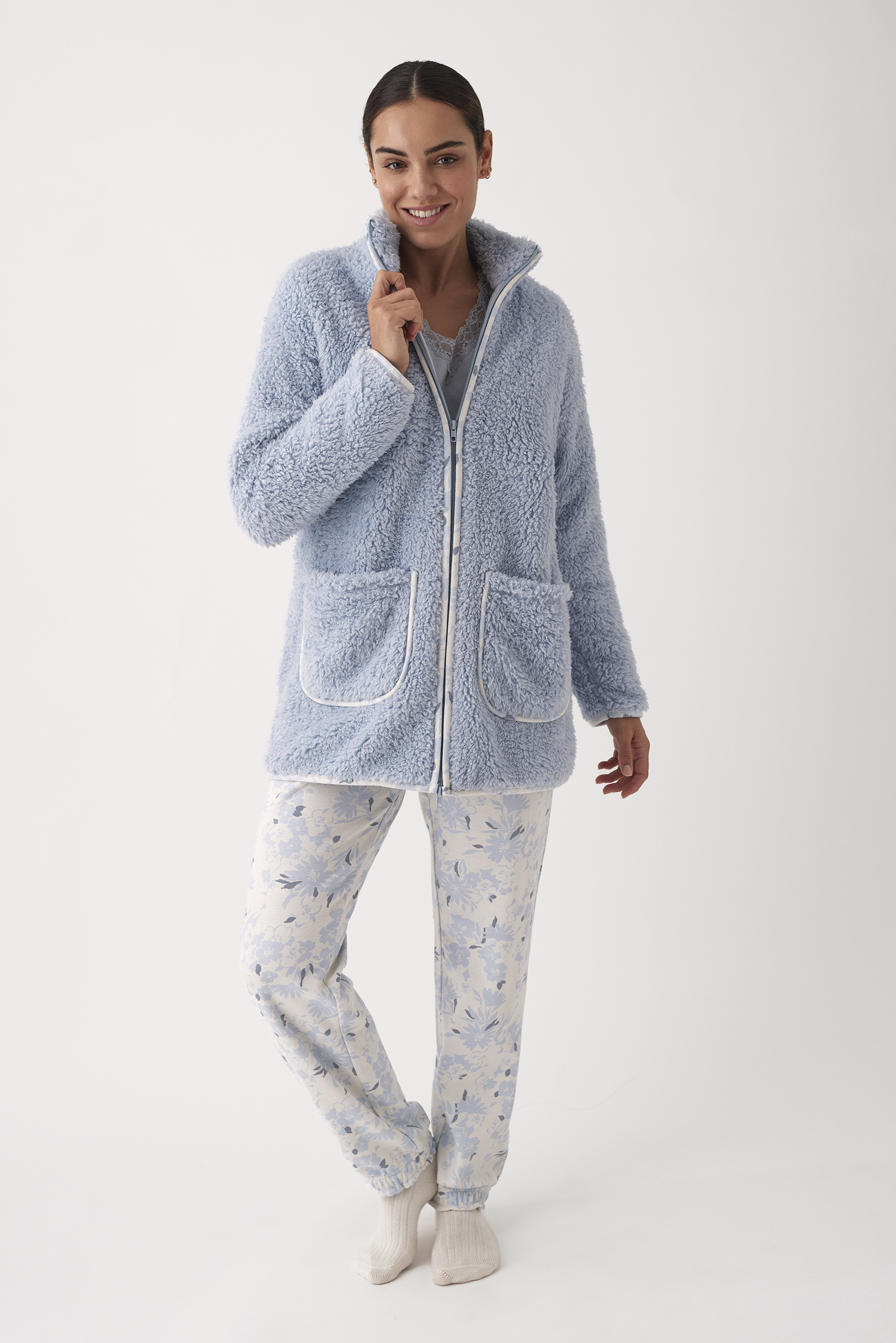 Bata 3/4 pelo peluche polar con bolsillos frontales, cuello mao y cierre con cremallera.