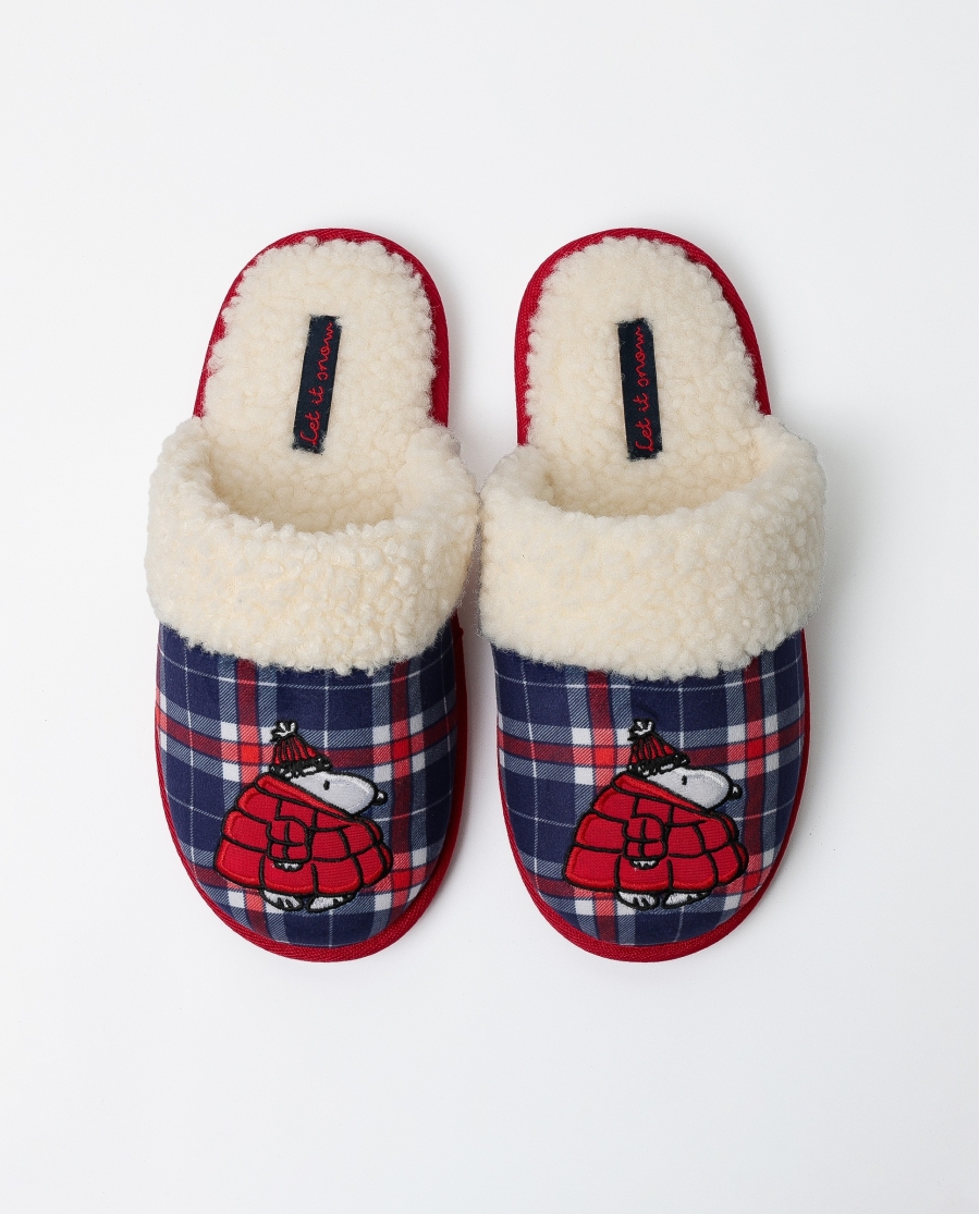 Con gracioso bordado de Snoopy en la nieve y fondo a cuadros.