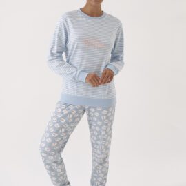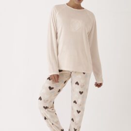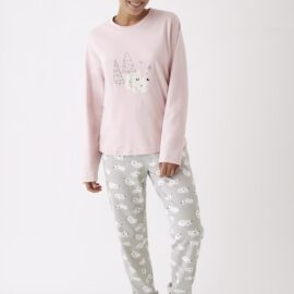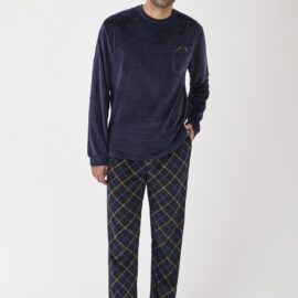 Pijama con camiseta lisa con cuello redondo y pantalón a cuadros y puños.