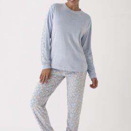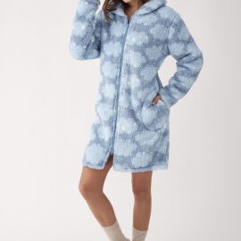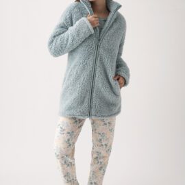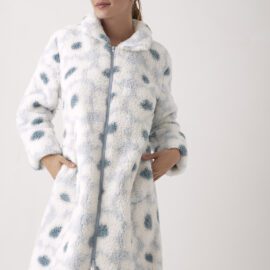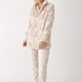 Bata corta polar con estampado floral, cuello mao, cierre con cremallera y bolsillos laterales. Cálida, suave y ligera.